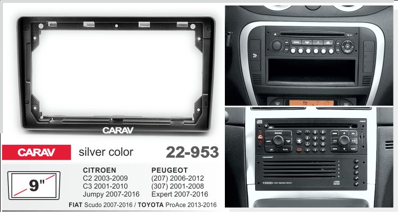 —CARAV 22-953 (9 дюйм. монтажная рамка для а/м CITROEN C2 03-09; C3 01-10; Jumpy 07-16;PEUGEOT 207 06-12;307 01-08,Expert 07-16 / TOYOTA ProAce 13-16